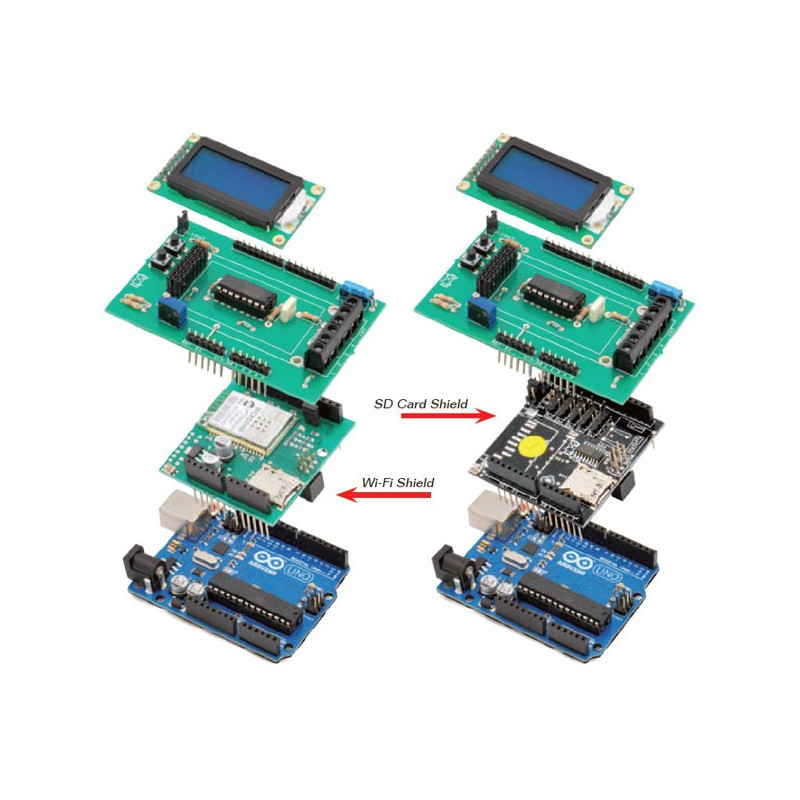 Il kit comprende solo il prodotto WEIGHT-SHIELD, mentre i prodotti ARDUINOUNOREV3, WI-FI SHIELD, SDCARD SHIELD e il sensore peso della bilancia Velleman (VTBAL8) sono acquistabili separatamente.