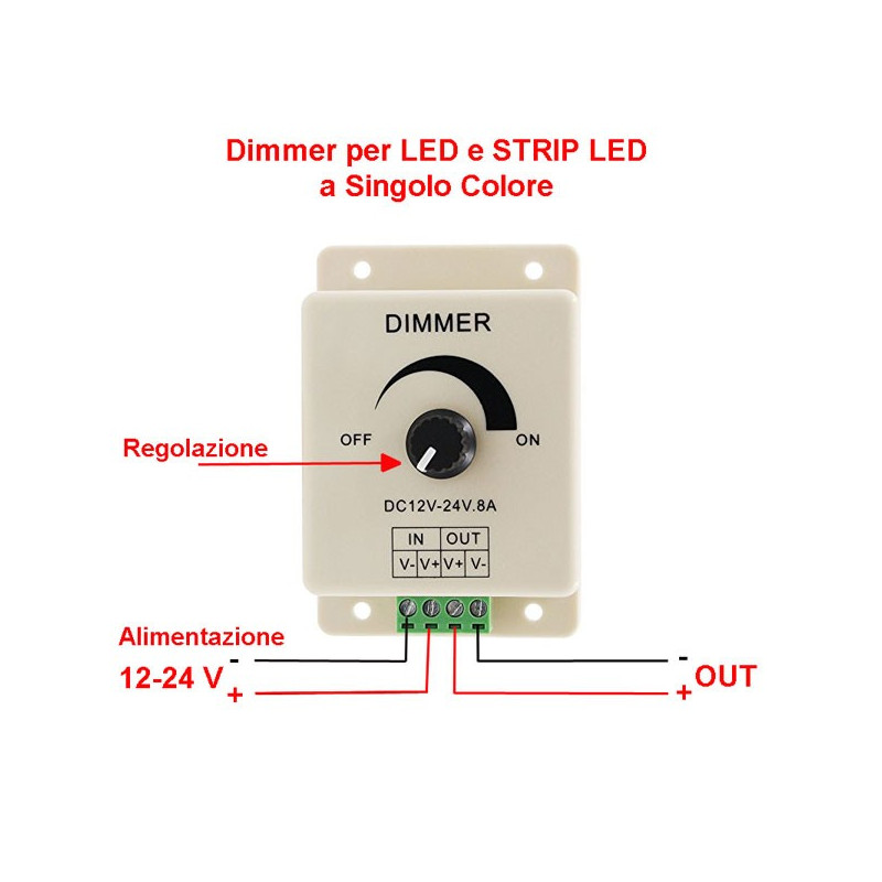 Adatto per modificare l'intensità luminosa di sorgenti luminose a led alimentate a tensione costante