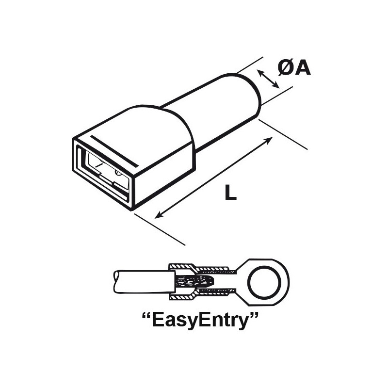 Faston femmina completamente isolato, in ottone stagnato, con collare di rinforzo in rame e con isolamento in PVC.