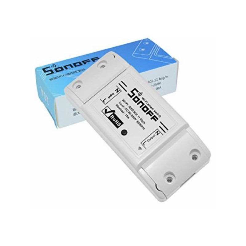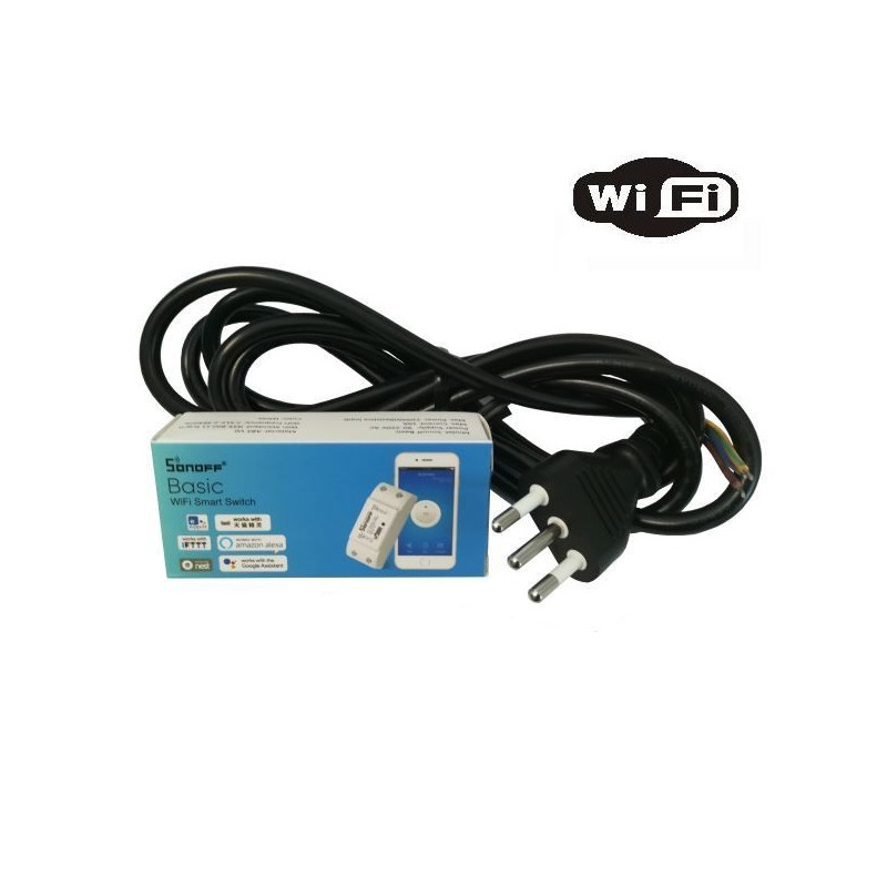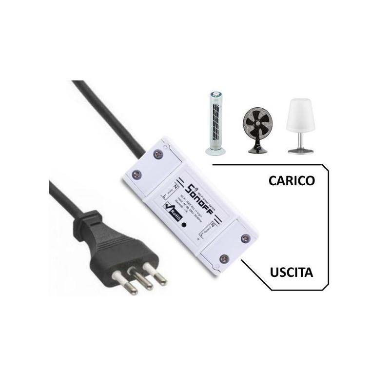 Semplice interruttore wifi da collegare direttamente alla tensione di rete 220 Vac e in grado di controllare un carico collegato alla sua uscita. Luci, ventilatori, stufe elettriche e tutto ciò che funziona con la tensione di “casa” può essere controllato tramite smartphone o tablet scaricando l’apposita App per iOS o Android. L’interruttore può supportare un carico fino a 10 A. Nella confezione oltre al dispositivo switch della Sonoff è presente un cavo di alimentazione di 2 metri, con spina a tre poli e in grado di supportare la corrente massima.