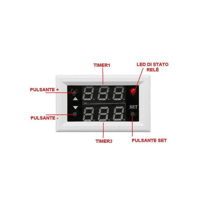 3) All’accensione il relè è disattivo, allo scadere del tempo impostato per TIMER1 il relè si attiva, allo scadere del tempo impostato per TIMER2 si disattiva.